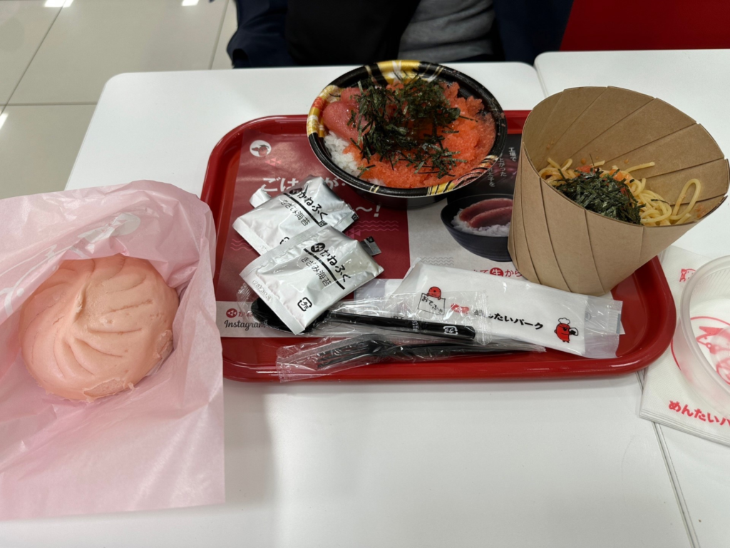 フードコートでは明太パスタや鬼盛明太子丼、肉まん、おにぎりが